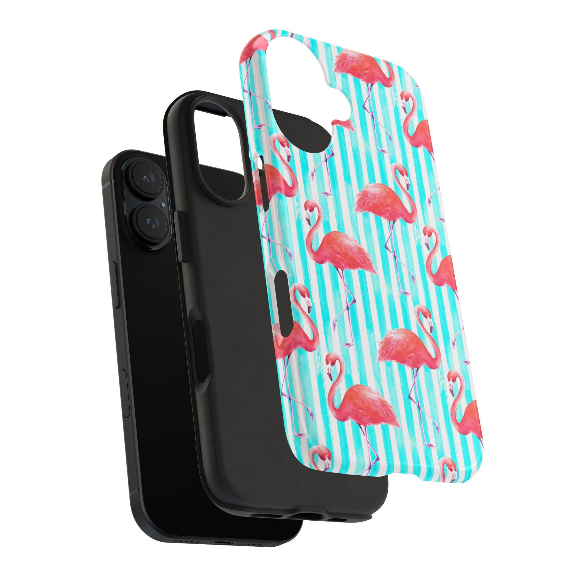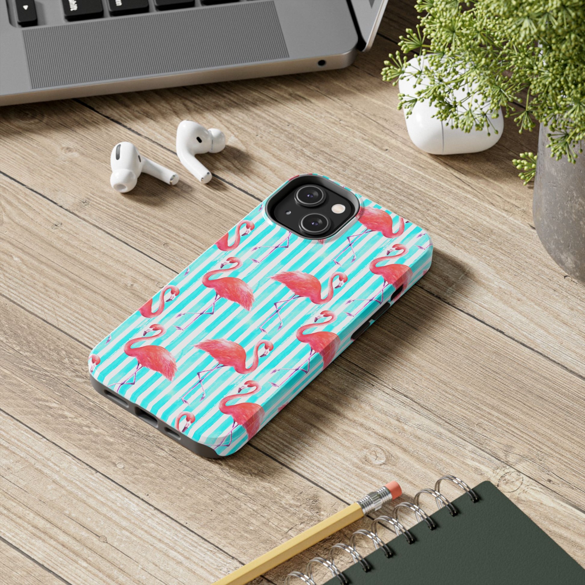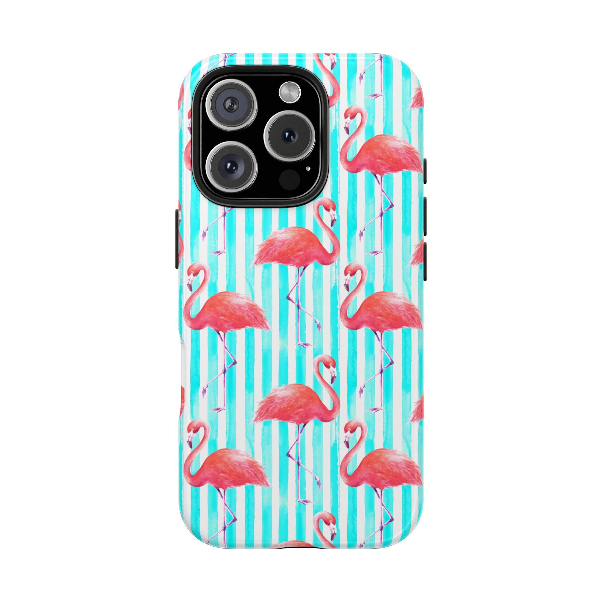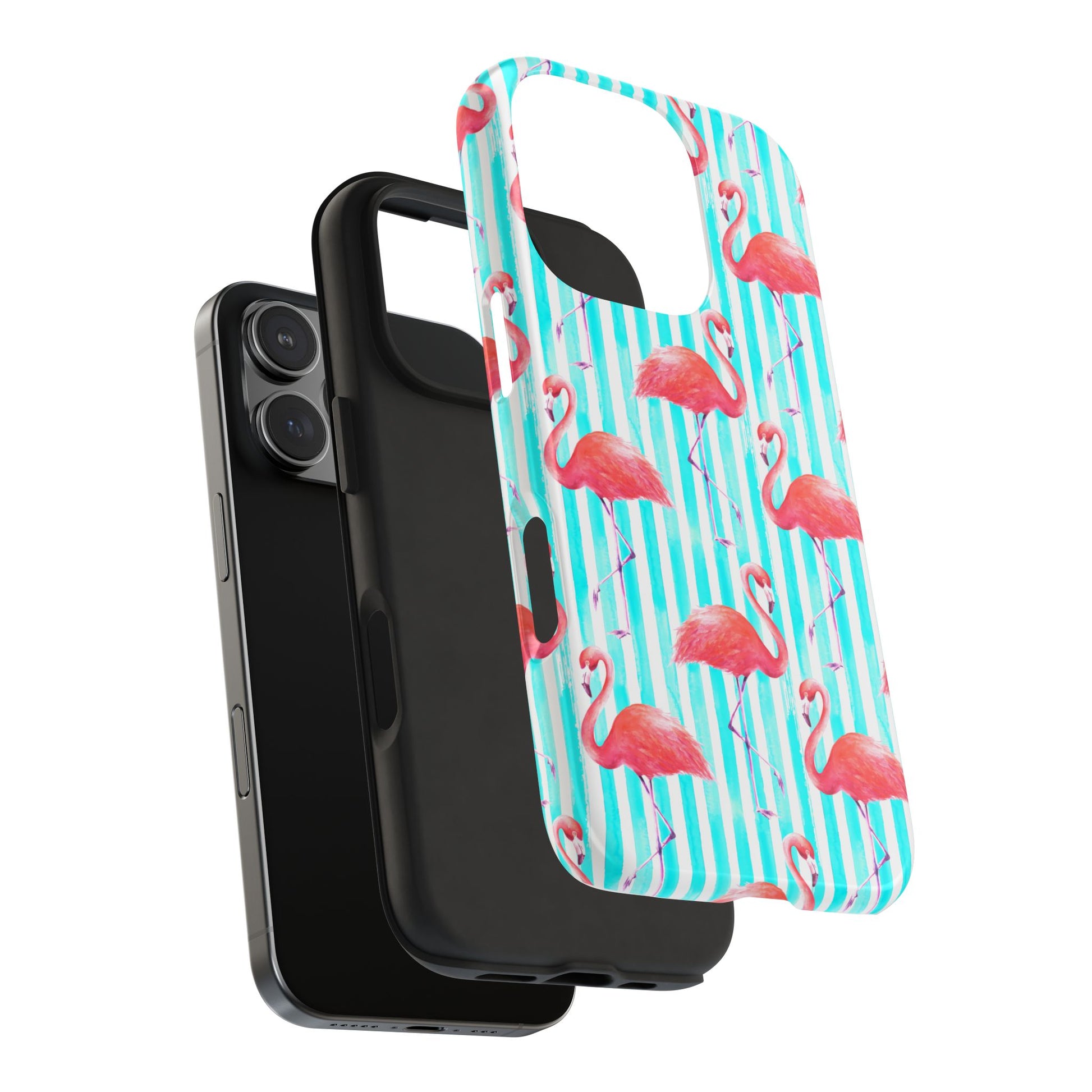 Introducing a playful and vibrant Tough Phone Case, perfect for those who want to showcase their unique style while protecting their device. With a fun flamingo design set against a cheerful blue and white striped background, this case brings a refreshing vibe to your daily routine. It's not just about looks; this case provides heavy-duty protection and is an ideal accessory for beach lovers, tropical vacationers, or anyone who enjoys a splash of color. Perfect for summer gatherings, birthdays, or as a thoughtful gift for friends and family who appreciate both functionality and fun in their tech accessories. Enhance your phone's personality while ensuring it stays safe from bumps and scratches!